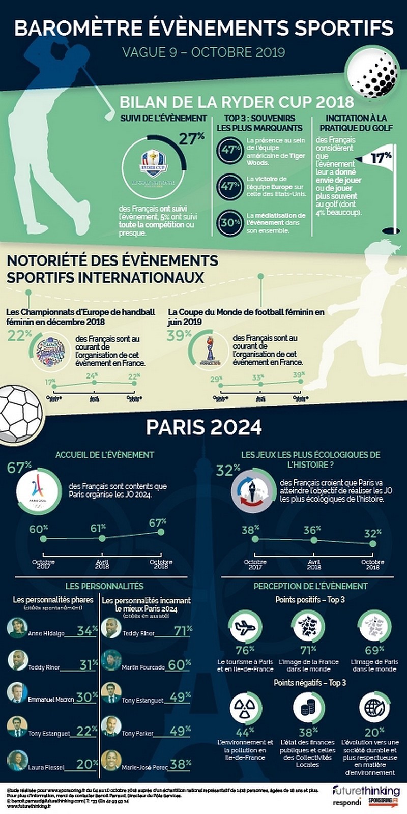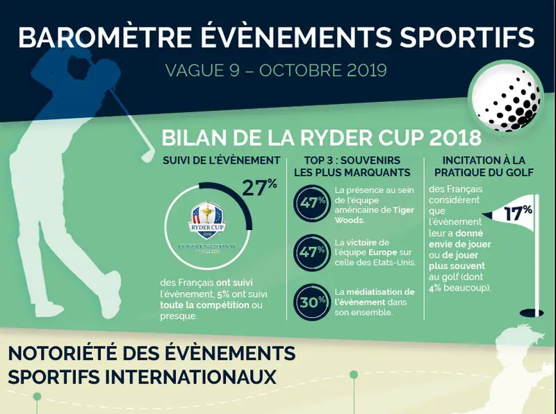 Évaluer la notoriété globale des événements internationaux qui vont se dérouler en France, telle est l’ambition du baromètre exclusif de Sponsoring.fr réalisé tous les 6 mois, en collaboration avec Future Thinking France et Respondi. Fil rouge du baromètre, l’intérêt des Français pour Paris 2024 continue aussi d’être mesuré. Qu’en est-il un an après l’annonce officielle d’obtention de l’organisation des Jeux olympiques et paralympiques de 2024 ? Pour la troisième fois, les personnalités de l’organisation et les impacts perçus par les Français sont également décortiqués. Cette neuvième vague du baromètre revient enfin sur la Ryder Cup 2018 que la France vient d’accueillir. Notoriété de l’événement, suivi des Français, et l’intérêt pour le golf sont passés au crible.
