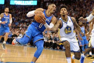 Russell Westbrook finished one assist shy of a triple-double as he scores 34 points, grabs 10 rebounds and hands out nine assists versus the Warriors.