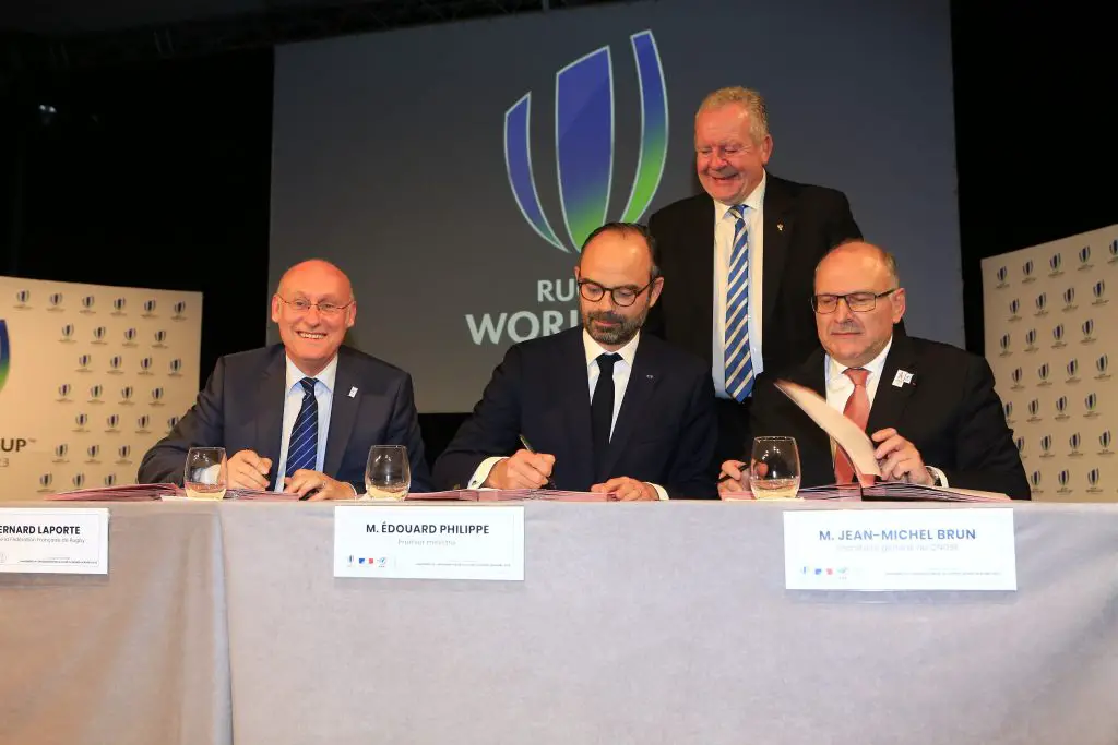 En ouverture du match France – Angleterre, le Premier Ministre Edouard Philippe, Bernard Laporte, président de la Fédération française de rugby (FFR) et Jean-Michel Brun, Secrétaire Général du CNOSF, ont symboliquement donné le coup d’envoi de la Coupe du Monde de Rugby 2023, en présence de Bill Beaumont, président de World Rugby, en signant la convention constitutive du Groupement d’Intérêt Public (GIP), constitué pour l’organisation de l’événement.