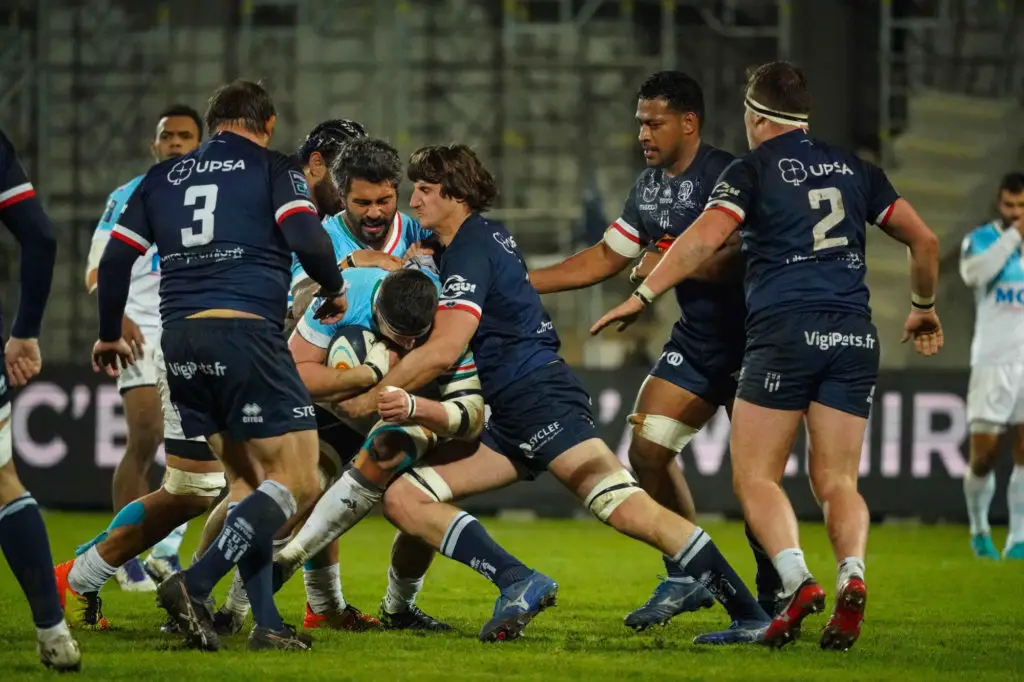 Gauthier MARAVAT SU Agen Denis MARCHOIS Aviron Bayonnais Yann DAVID Aviron Bayonnais Stade Armandie le 6 janvier 2022 à Agen, France. (Photo by Pierre Costabadie/Icon Sport)