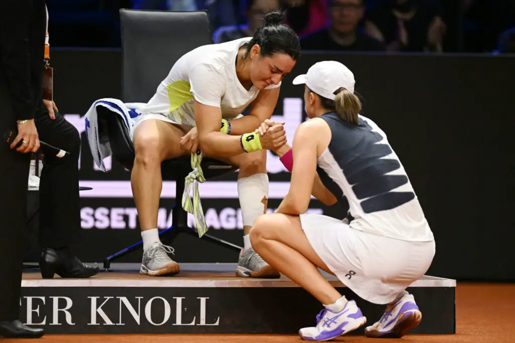 « J’ai une petite déchirure au mollet et je vais avoir besoin d’un peu plus de temps pour récupérer », a indiqué la Tunisienne sur ses réseaux sociaux : « Je suis triste d’annoncer que je ne pourrai pas jouer et défendre mon titre » à Madrid. Samedi, Jabeur s’est blessée dès le premier jeu en demi-finale à Stuttgart contre la numéro une mondial Iga Swiatek. Après s’être fait soigner, elle avait encore tenu deux jeux avant de renoncer, les larmes aux yeux. L’an dernier, la joueuse de 28 ans avait triomphé à Madrid en battant en finale l’Américaine Jessica Pegula.